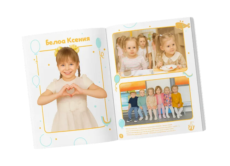 На выбор доступны 13 оригинальных дизайнов, среди которых «Рисунки», «Пиксель», «Африка», «Игрушки» и другие. Каждый альбом включает портрет ребенка, виньетки всех выпускников, групповые и сюжетные фотографии, а также портреты воспитателей.