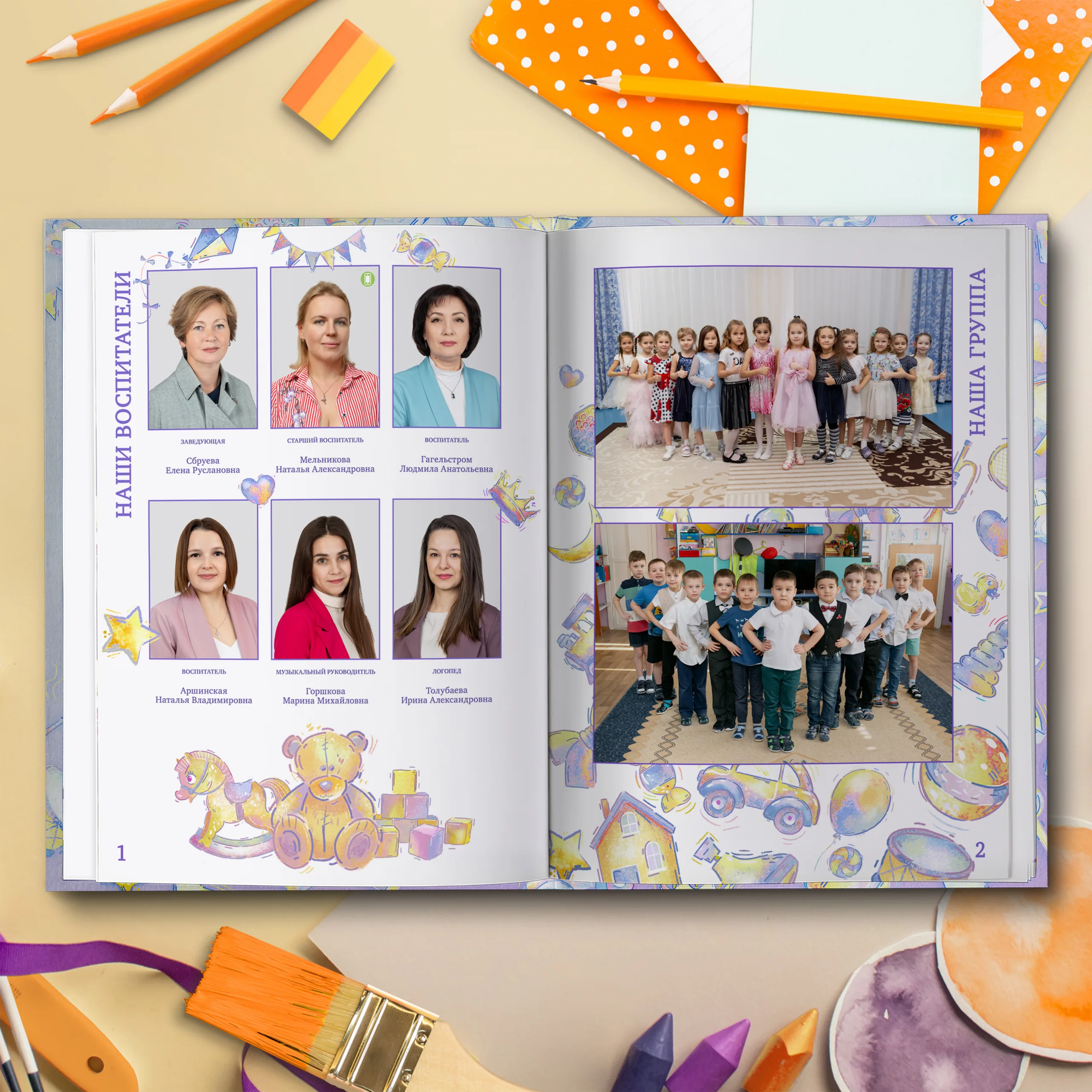 1ый разворот — виньетки педагогов и две общие фотографии