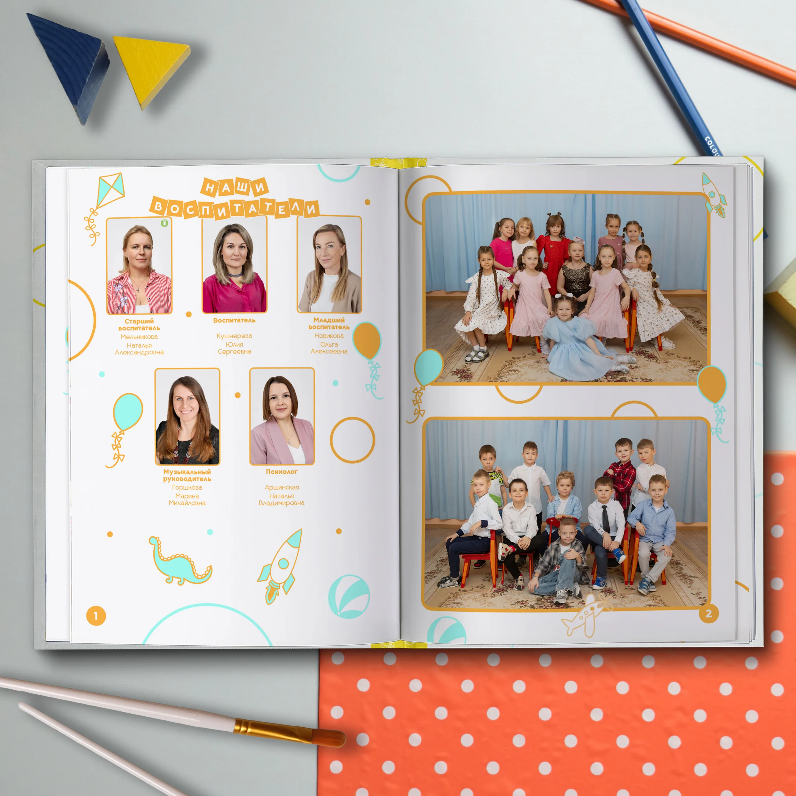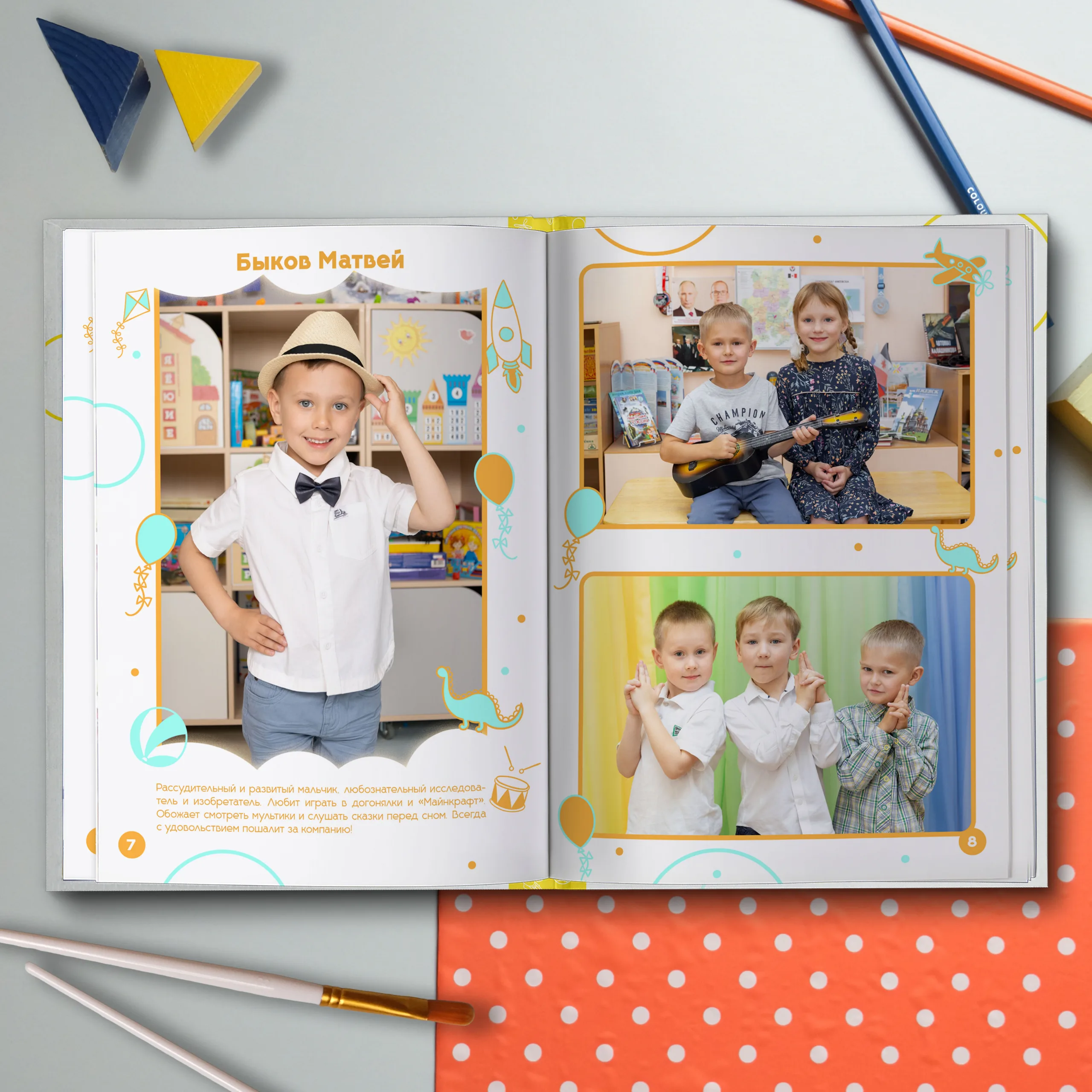 3ий разворот и далее — личные страницы выпускников (портретная фотография и 2 фотографии личного репортажа)