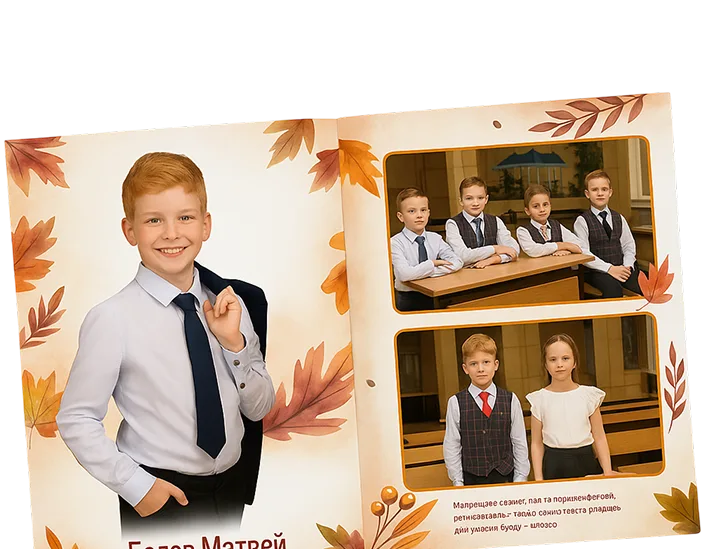 Наша команда фотографов, дизайнеров и менеджеров работает слаженно, чтобы готовый альбом передавал атмосферу школьных лет, дружбы, первых чувств и светлых надежд на будущее.