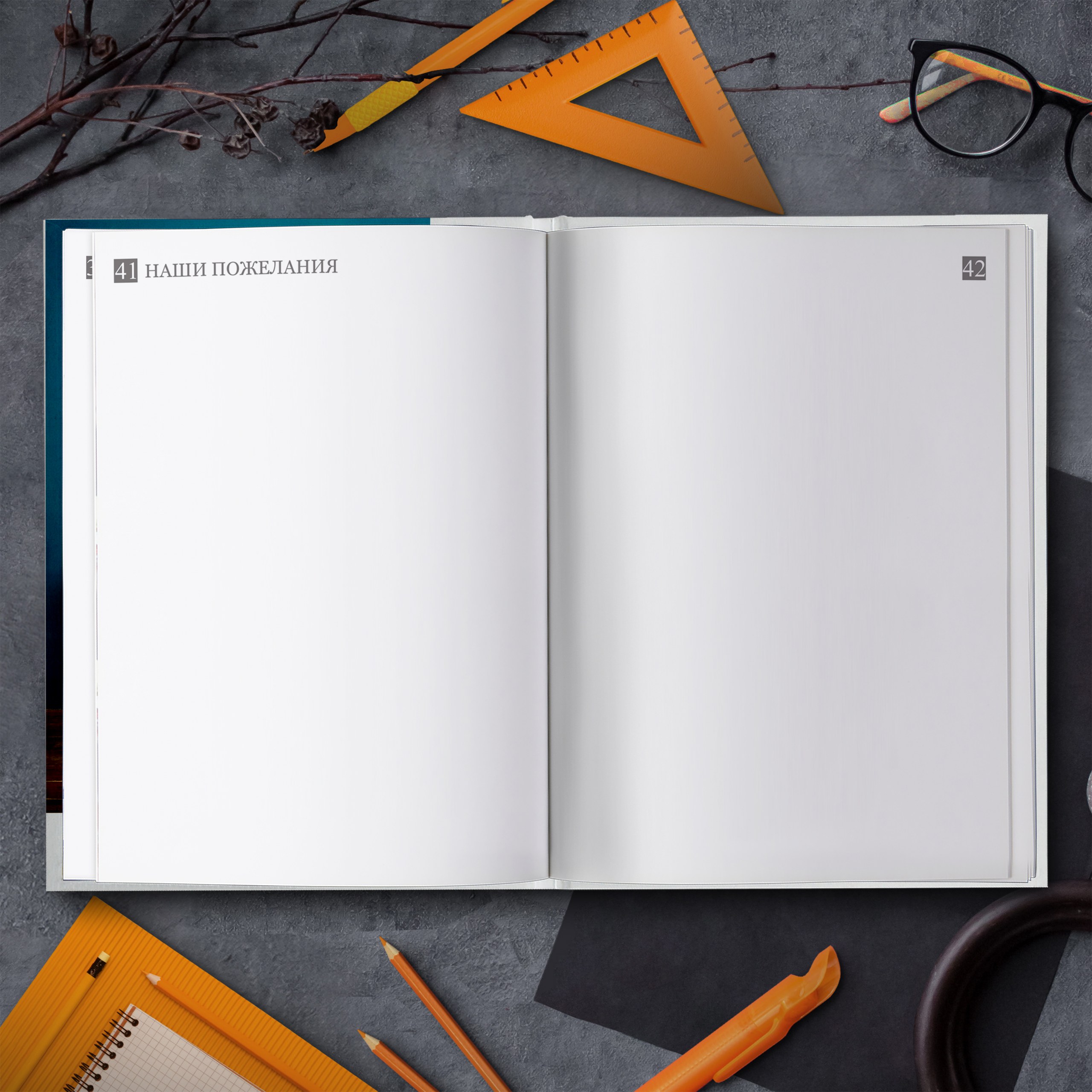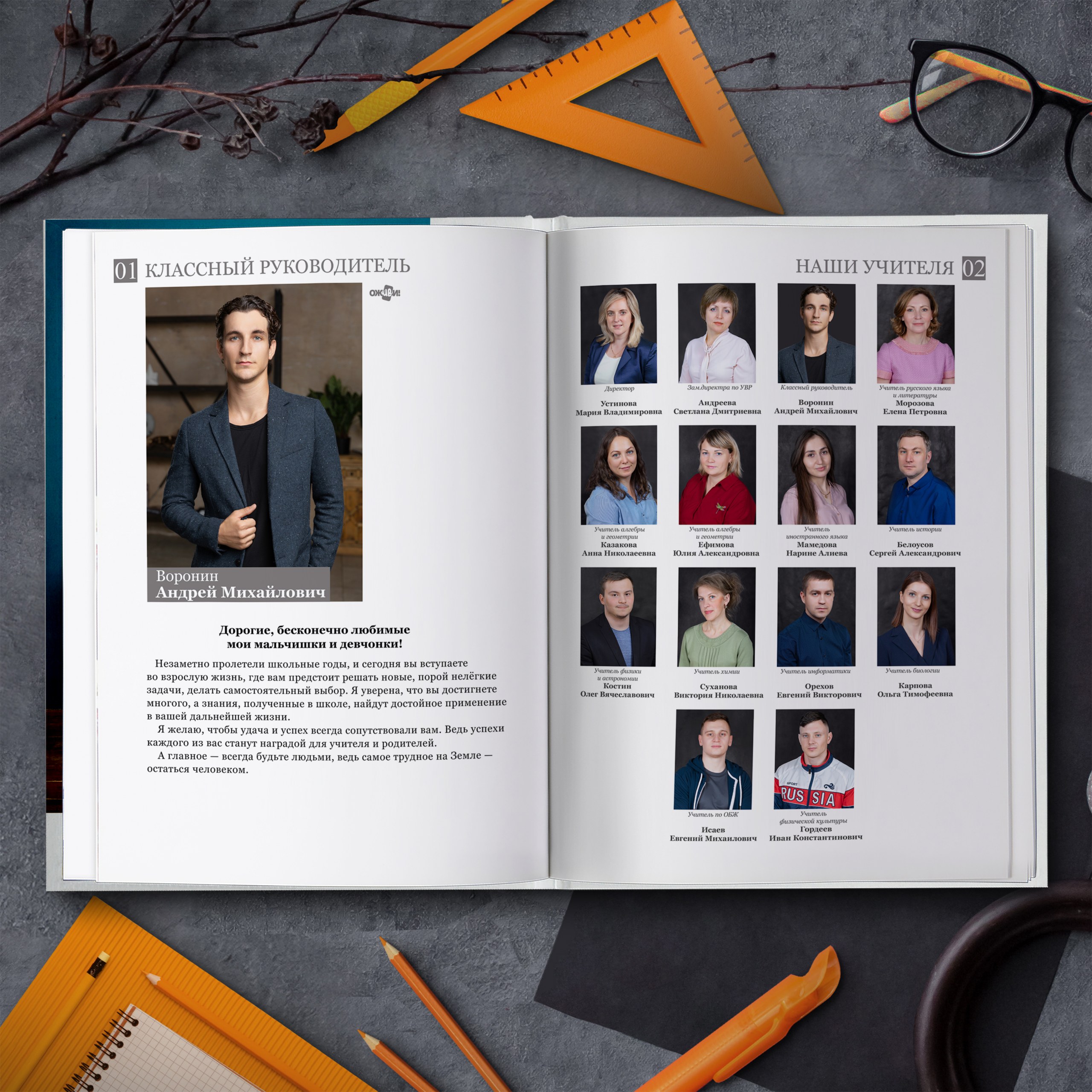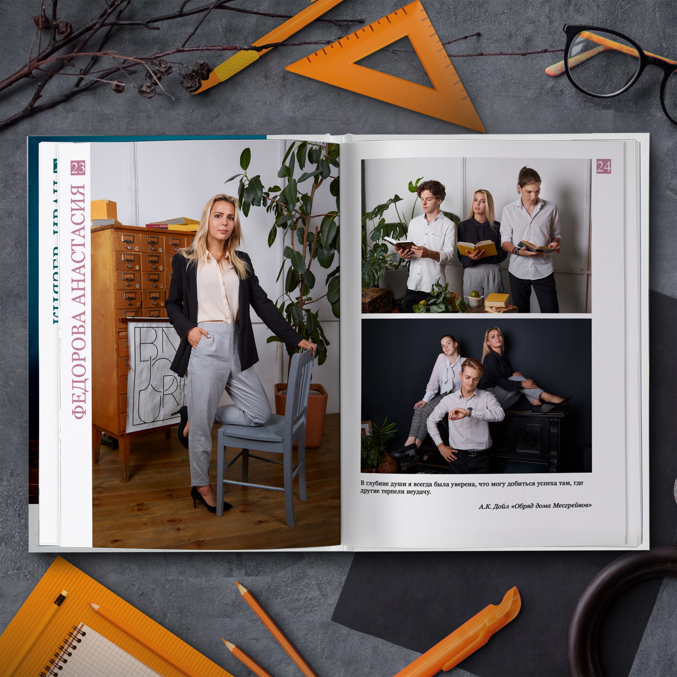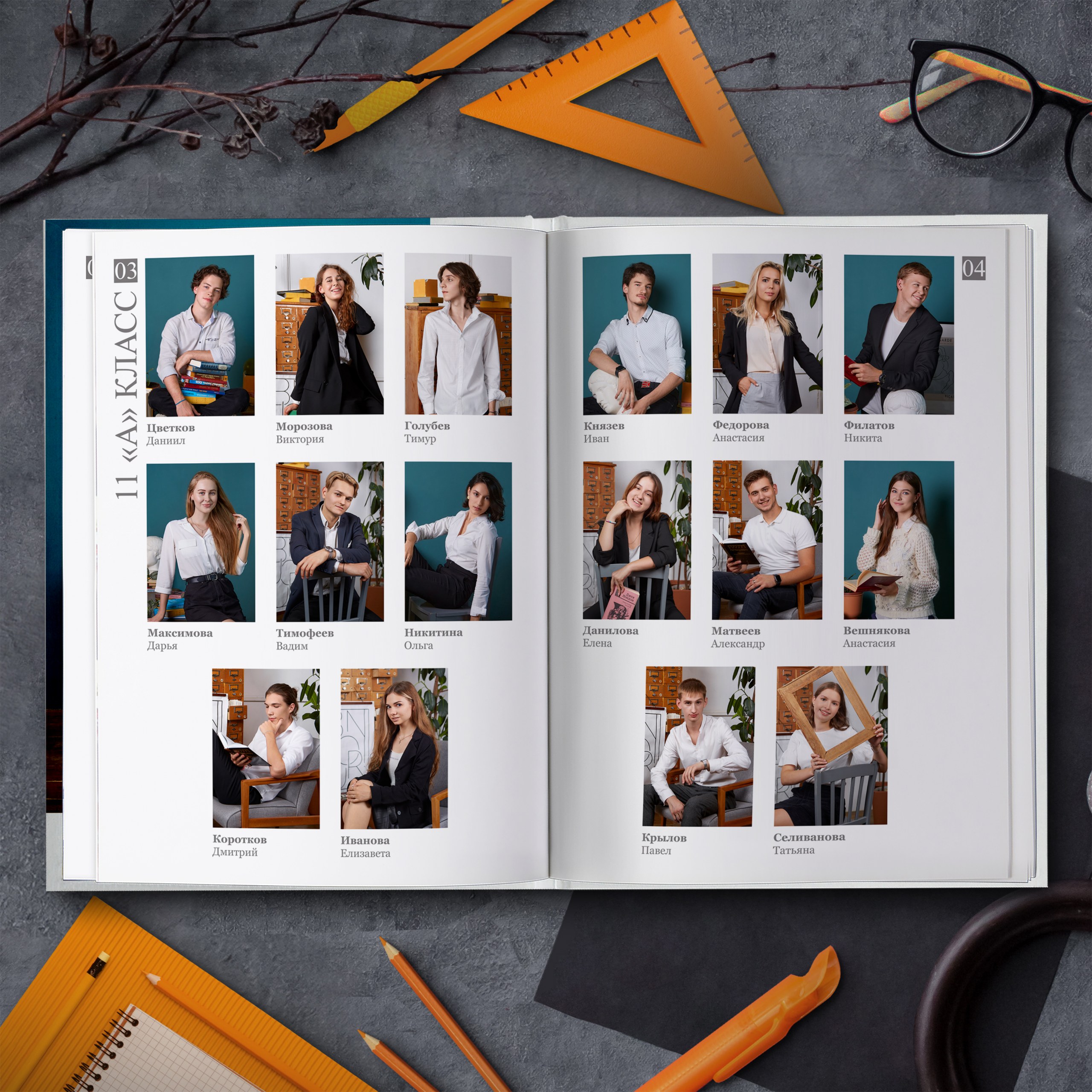 Съемка проходит в антураже школы. И помимо полного разворота с общей фотографией, мы добавили личную страницу для каждого ученика с фотографией, снятой в лучших традициях интерьерной съемки.